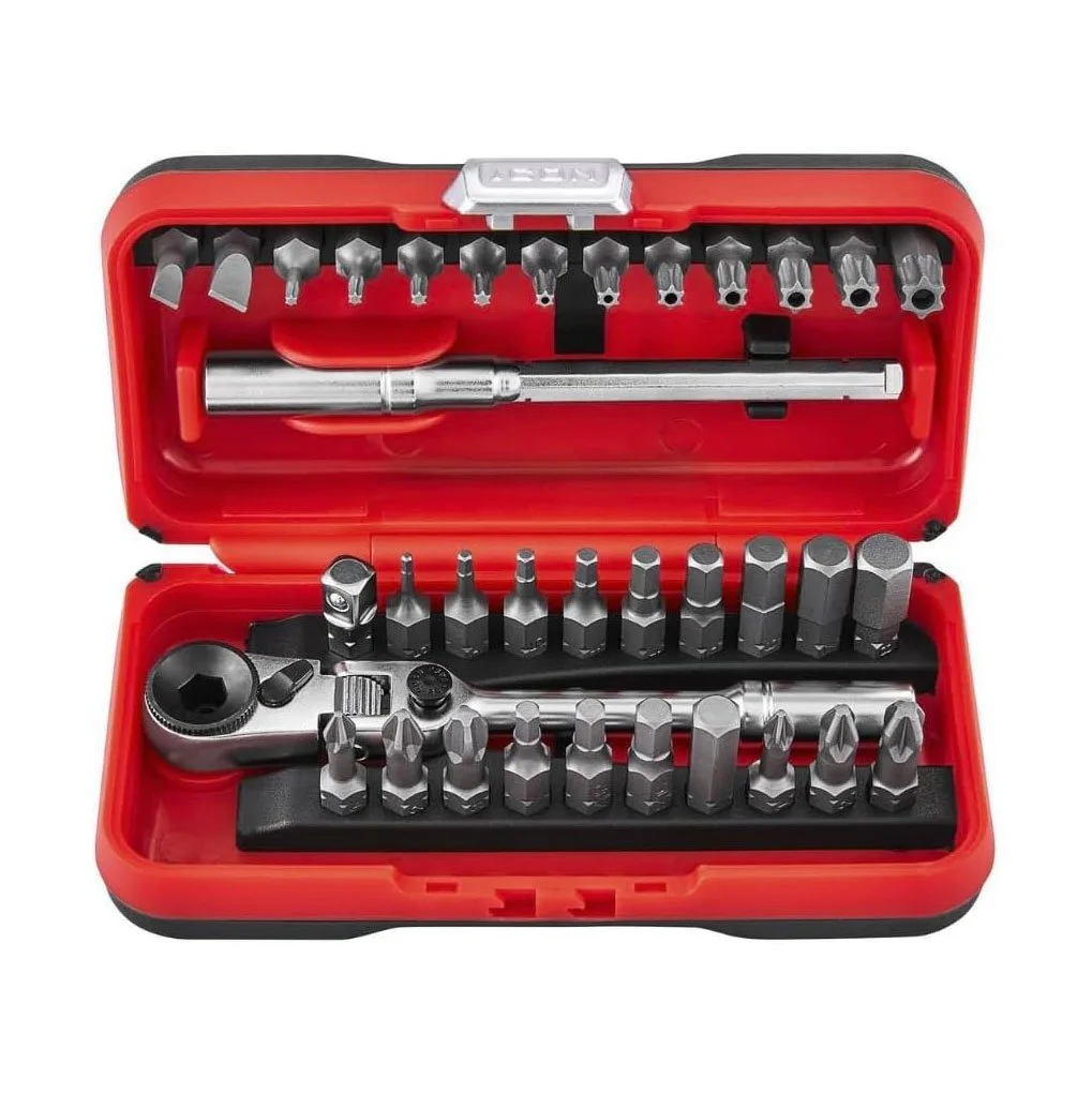 The Locking Flex Head Ratchet and Bit Set (35-Piece) is a versatile and durable toolkit designed for precision and flexibility in various tasks. This set includes a 35-piece assortment of bits and a locking flex head ratchet, offering the ability to tackle jobs in tight or awkward spaces. The ratchet features a flexible head that can be adjusted to different angles, allowing for maximum reach and convenience during use.