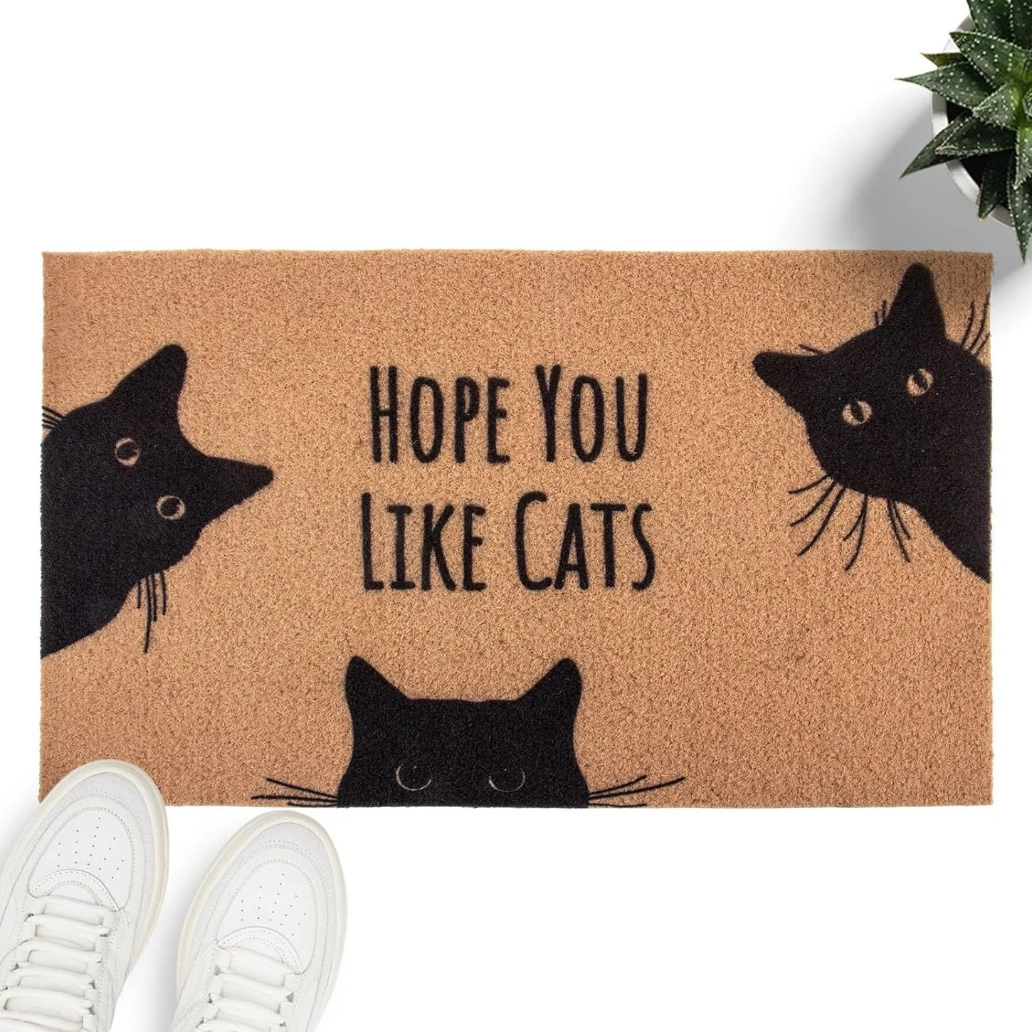 Welcome guests in true cat‑lover style with this coir doormat featuring a cheeky “Hope You Like Cats” greeting and peeking kitty graphics. Durable, non-slip, and easy to clean—just shake or vacuum—it’s a purr‑fect way to ensure only feline-friendly visitors step inside.