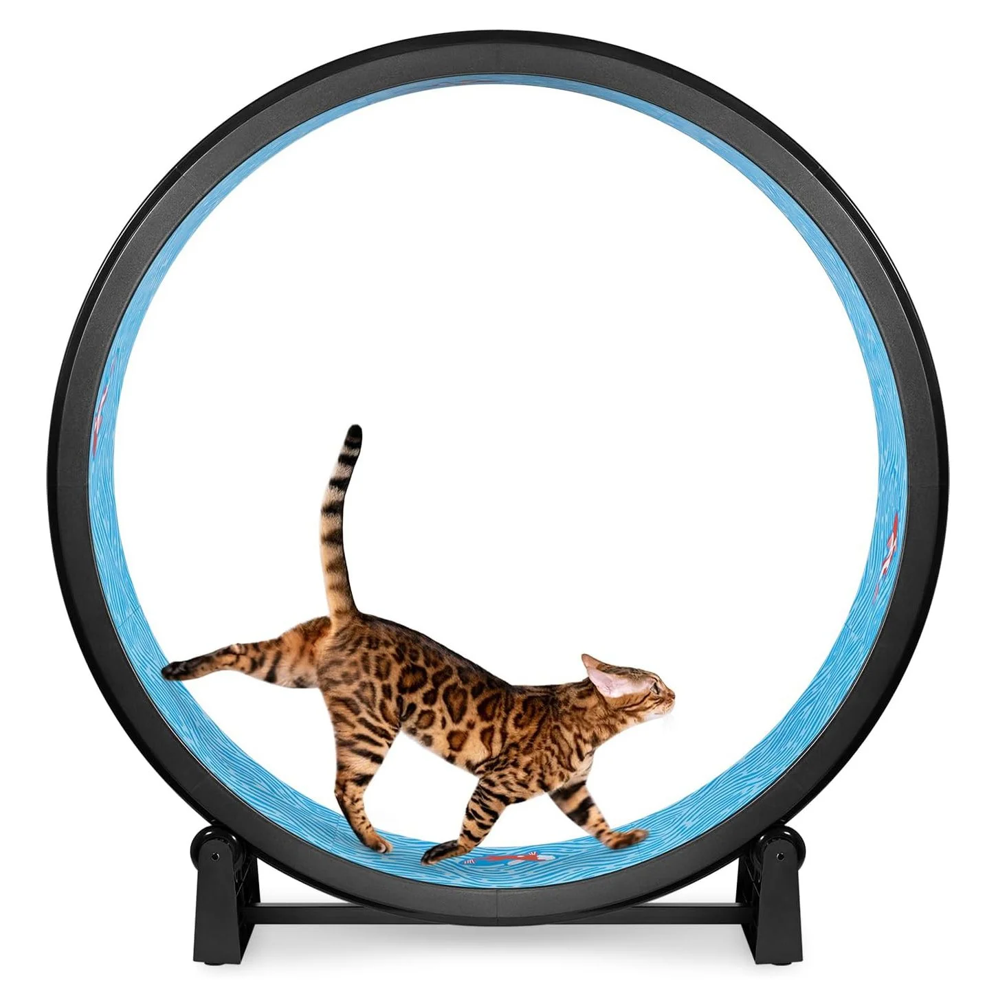 Helps prevent boredom and destructive anxiety behaviors by giving indoor cats an outlet to burn excess energy. Most cats can learn to use the wheel with a bit of daily training for a couple weeks. Older cats or low energy cats may need more training. The 48" diameter wheel is big enough to accommodate cats up to 25 lbs.