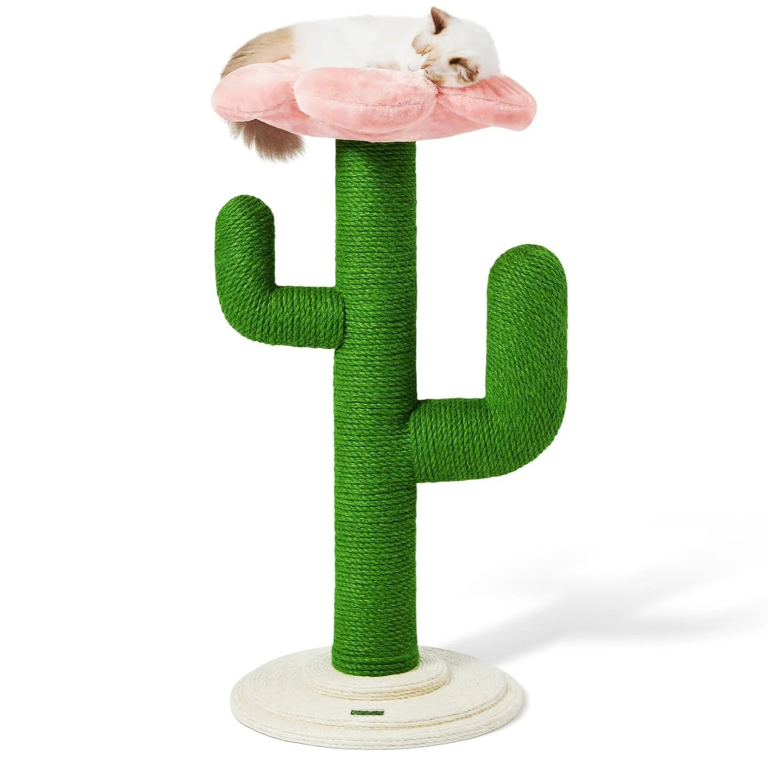 Bring the desert indoors with this tall cactus-shaped cat tree packed with scratching and lounging spots. Wrapped in natural jute, it’s tough enough for active cats and soft enough for dreamy naps in the cozy flower hammock. A sturdy, climbable haven that protects furniture and pampers paws.