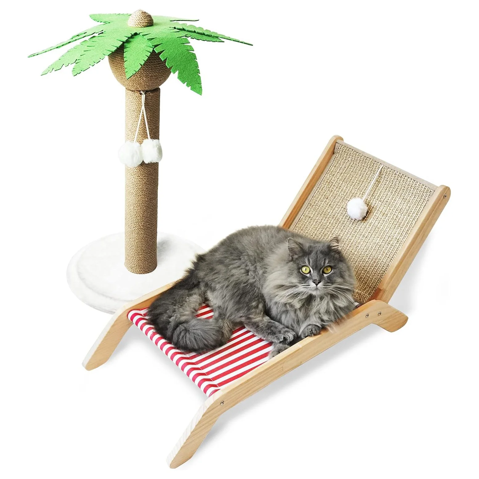 Give your cat a taste of the tropics with this beach-chair-style hammock paired with a coconut palm tree scratching post—perfect for lounging, chilling, and scratching. The solid pine wood frame and natural sisal mat offer durability and stability, while the playful dangling toy ball keeps claws engaged. Anti-slip legs help it stay put during zoomies.