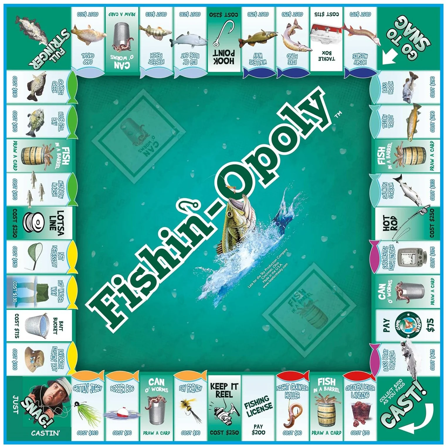 Trade in your top hat for a tackle box with Fishin'-Opoly, the strategy game where you reel in properties instead of real estate. Designed for 2 to 6 players, this themed board game challenges you to buy, sell, and trade your favorite fish while avoiding the dreaded "High Water" or getting "Snagged." Players can choose from unique pewter tokens—including a reel, a lure, and a boot—to navigate around the board and collect "Big Fish" to increase their rent. Perfect for family game nights or as a gift for anglers, it combines classic trading mechanics with authentic fishing humor that will have everyone hooked from the first roll of the dice.