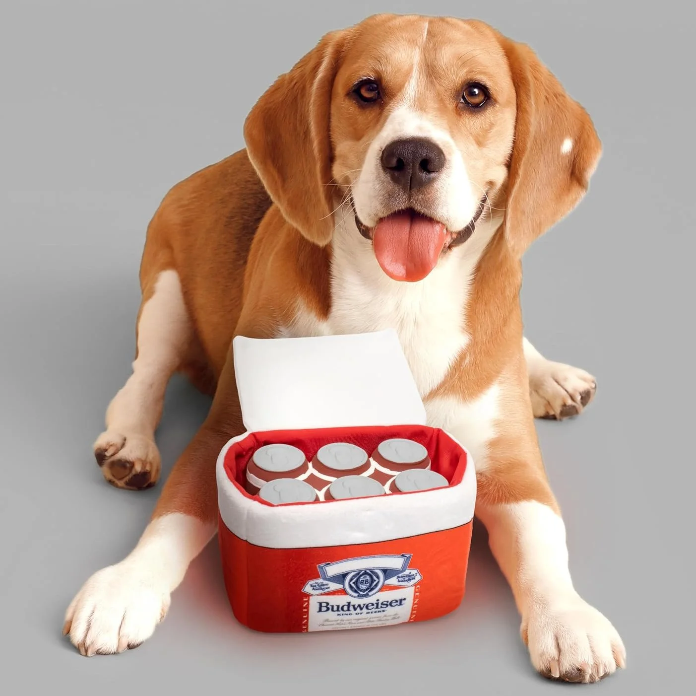 Every successful fishing trip needs a reliable first mate, and now your pup can carry the "supplies" with this Budweiser Tailgate Pack. This multi-part interactive toy features a soft, plush cooler bag—perfect for stowing away while you’re casting lines—that holds a removable six-pack of squeaky rubber bottles. While you're waiting for a bite, your dog can stay busy with the satisfying squeak of the latex bottles, which are durable enough for fetch but gentle on the mouth. To make sure they look the part of a seasoned angler, the set includes an official Budweiser bandana, ensuring your dog is the sharpest-looking member of the crew at the dock.