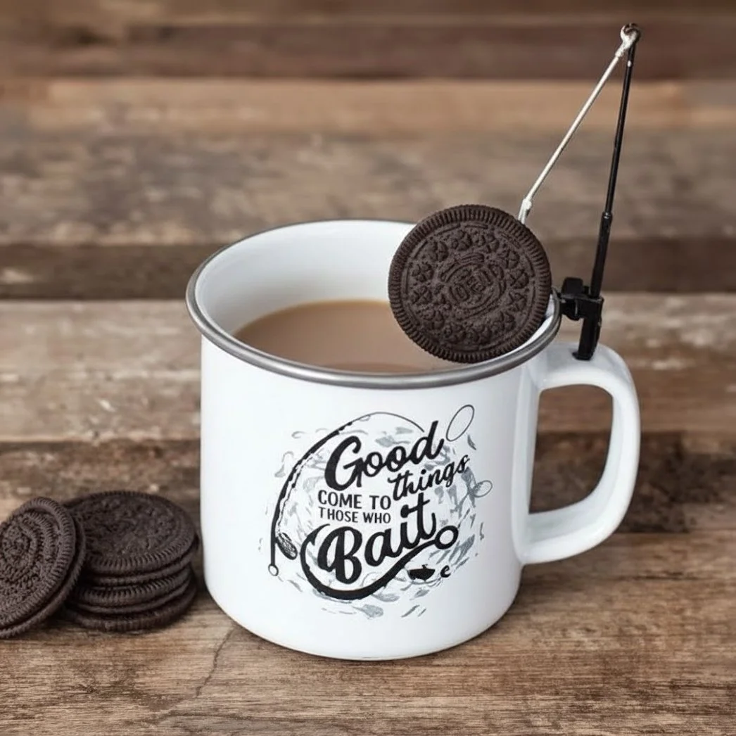 Elevate your morning brew with the ultimate interactive coffee break designed specifically for the dedicated angler. This high-quality ceramic mug features the witty "Good Things Come to Those Who Bait" slogan and includes a unique miniature fishing rod designed for precision cookiem biscuit and tea bag dunking. The oversized handle provides a secure grip even during early morning starts, while the novelty rod allows you to "catch" your favorite snacks without getting your fingers wet. It is a hilarious yet functional addition to any tackle-box-inspired kitchen, perfect for the fisherman who wants to practice their casting skills between sips.