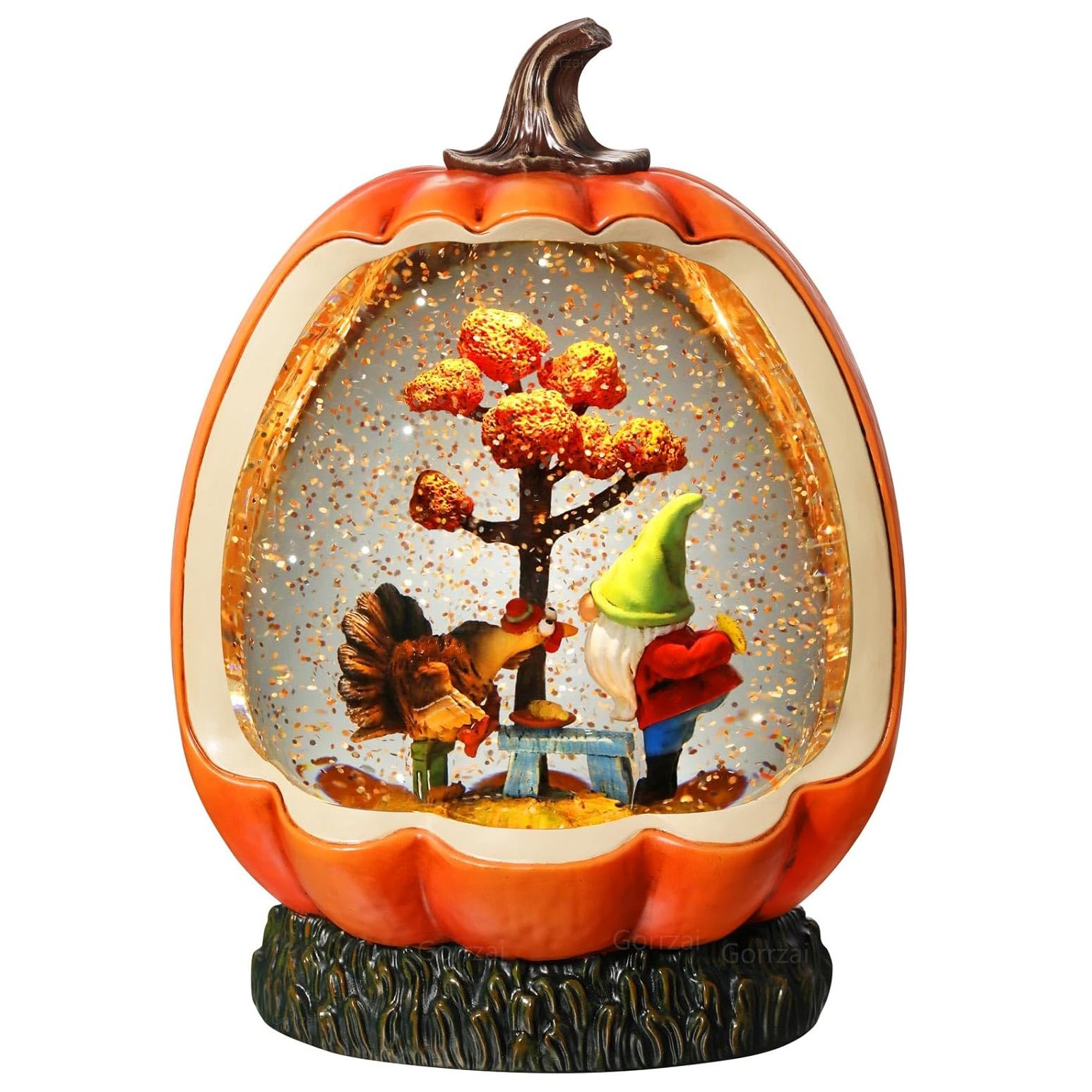 Add a sprinkle of magic to your Thanksgiving table with this illuminated pumpkin snow globe. Inside, a festive gnome and turkey swirl in glittering autumn light, capturing the cozy spirit of fall in motion. Powered by USB or batteries with a built-in timer, it’s a heartwarming accent that keeps your décor glowing all season long.