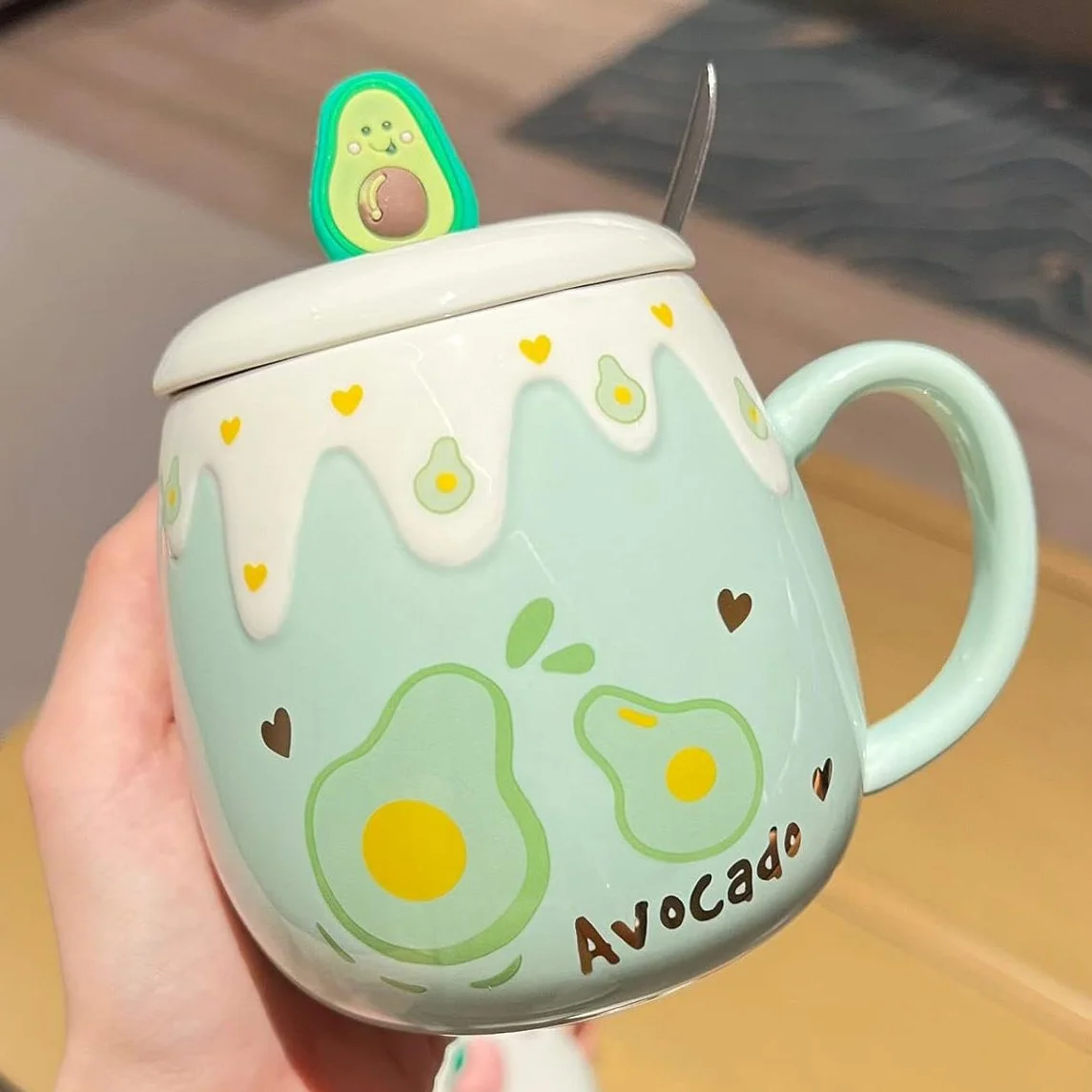 Brighten your morning routine with this avocado-themed ceramic mug featuring a snug lid and built-in spoon. At 13.5 oz (400 ml), it’s ideal for coffee, tea, smoothies, or even savory soups. Microwave-safe and thoughtfully designed for easy sipping and spill-free enjoyment, it’s a kawaii pick-me-up that blends style with practical charm.