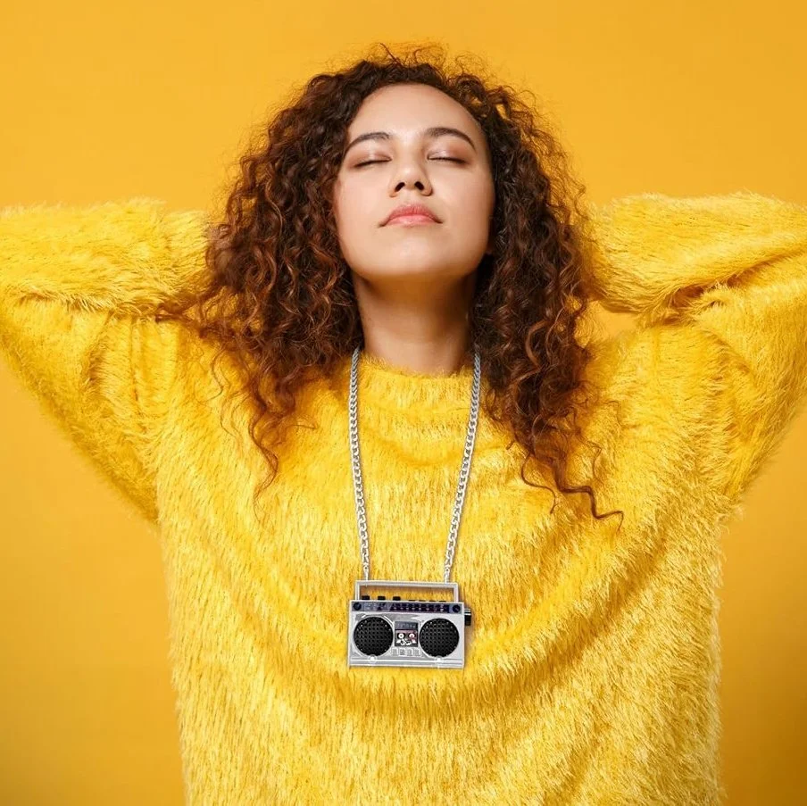 For the one still dreaming in neon, this wearable speaker rewinds time to the golden age of mixtapes and big hair. Rocking onboard buttons, FM radio, and a 27-inch chain, it’s like strapping the ’80s around your neck—with dual micro speakers and serious throwback attitude.